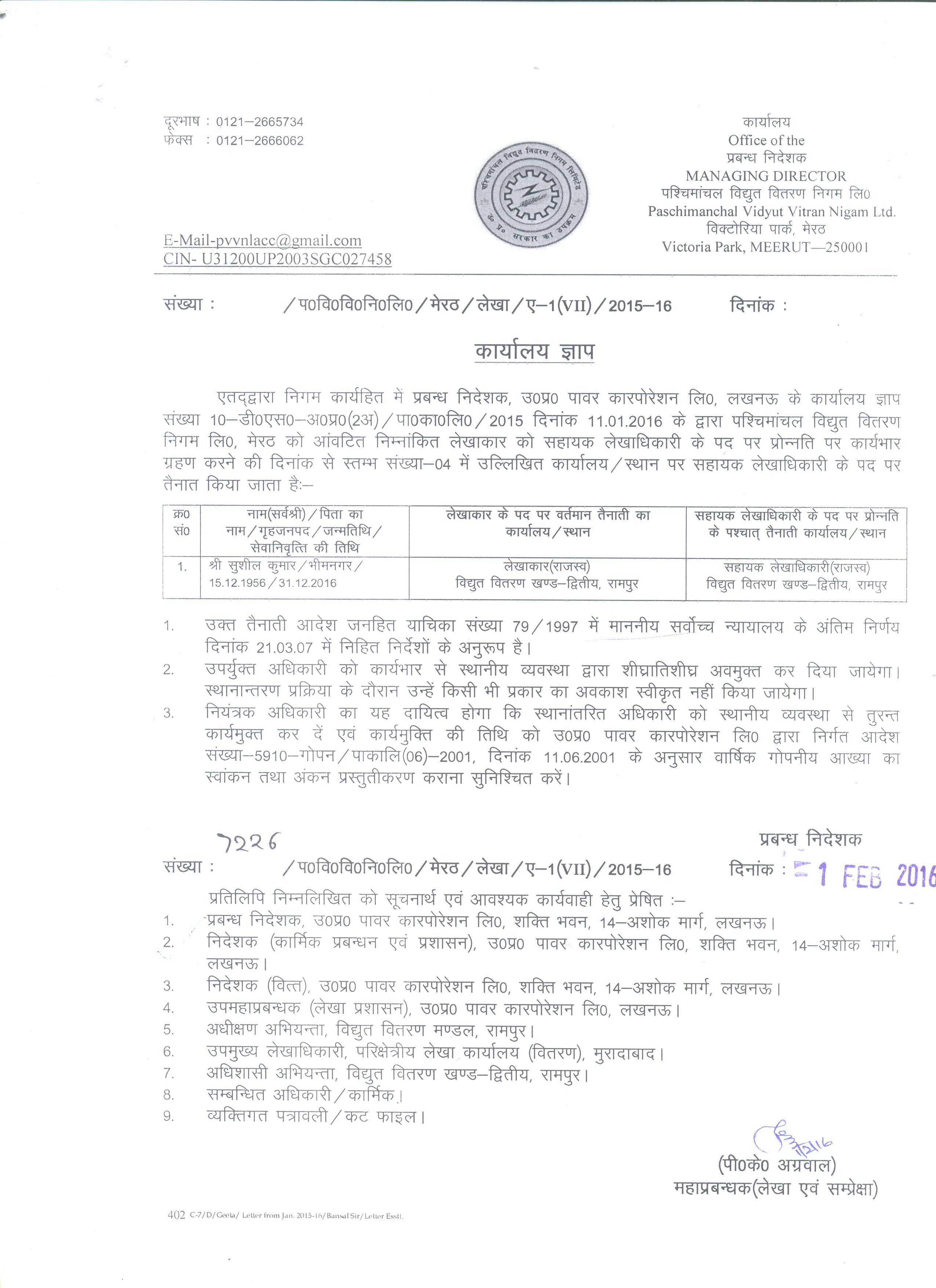 Promotion/ posting of Shri Suresh Chandra (2005316)/ Meerut.  |